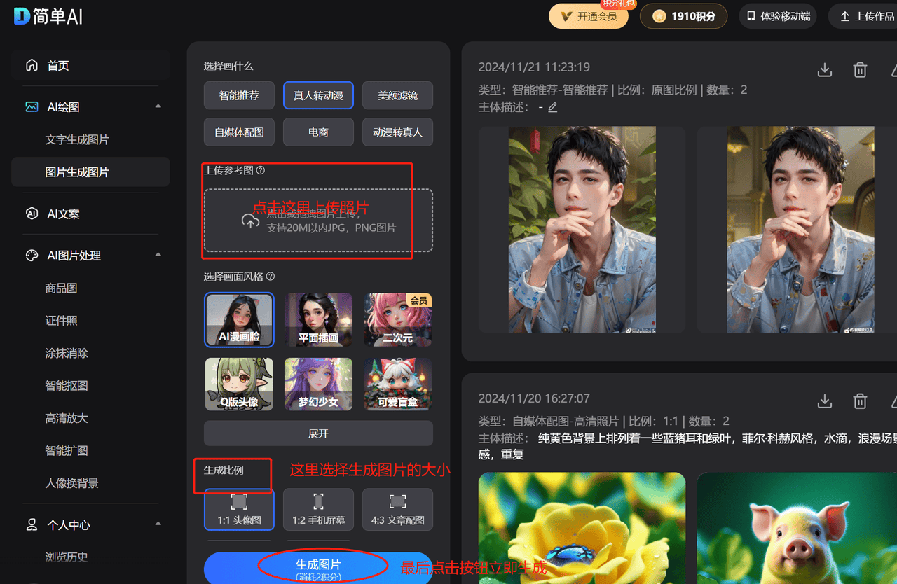 简单AI还有不少适用的AI功能,能够选择喜好的漫画气概结果,查看更多